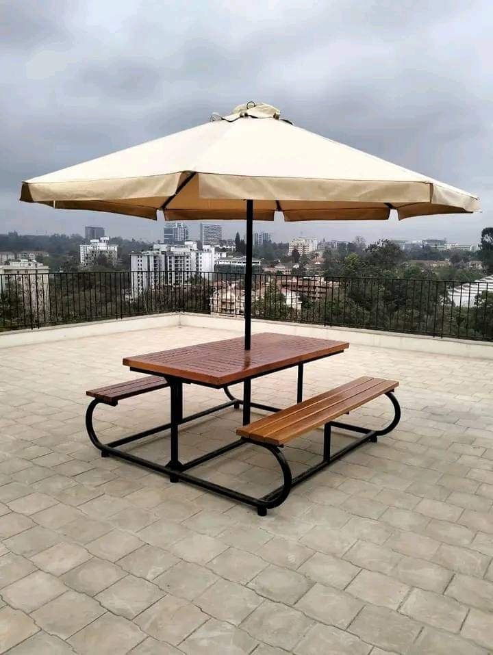 This stylish outdoor picnic table set is designed for comfort, durability, and all-weather use. It features a strong metal frame, a spacious wooden tabletop, and two integrated bench seats, making it ideal for gardens, rooftops, patios, schools, parks, and commercial outdoor spaces. The large center-mounted parasol provides excellent shade, protecting users from direct sunlight and light rain.